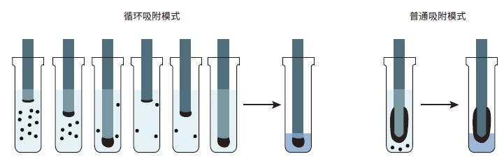 通过速度可调的循环吸附模式,磁棒缓慢下行的过程中,磁珠吸附于磁棒头部,从而保证洗脱体积很小的情况下,洗脱液依然可以覆盖全部磁珠,多次循环,即使小粒径磁珠也可确保无漏网之鱼。