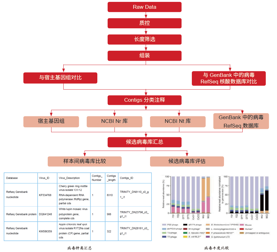 宏病毒组(Virome)即病毒宏基因组测序,是在宏基因组学理论的基础上,结合现有的病毒分子生物学检测技术而兴起的一个新的学科分支。宏病毒组直接以环境中病毒的遗传物质(DNA 或RNA)为研究对象,能够快速准确的鉴定出环境中所有的病毒组成,在病毒发现、病毒溯源、微生物预警等研究方面具有重要作用。