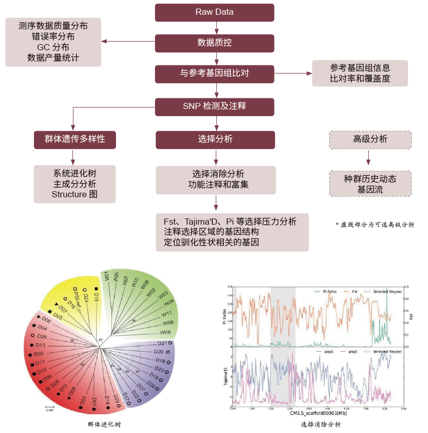群体遗传进化,是通过某物种自然群体各亚群代表个体的全基因组重测序技术获得基因组信息,通过与参考基因组比对,得到大量高准确性的 SNP、InDel、SV、CNV 等变异信息,并进行群体遗传学分析,讨论群体的遗传结构、基因交流情况、物种形成机制以及群体进化动态等生物学问题。筛选到的受选择压力作用的基因组区域,通常是重要的功能区域,对于理解功能对环境的适应有重要指导意义。