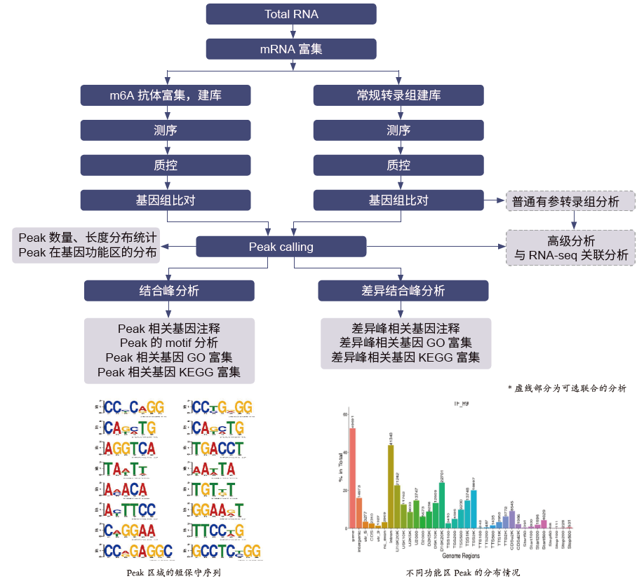 RNA 甲基化在调控基因表达、剪接、RNA 编辑、RNA 稳定性、控制mRNA 寿命和降解等方面扮演重要角色。RNA 甲基化免疫共沉淀 (Methylated RNA Immunoprecipitation,MeRIP)是基于 m6A 特异性抗体识别并结合 mRNA上 m6A 的原理,结合RNA 免疫共沉淀和高通量测序技术,实现全转录组水平上RNA 甲基化分析的技术。该技术无法分析到碱基水平,只能得到甲基化peak calling region,能够全面、快速地检测全转录组范围内的m6A peak、motif 和差异peaks。