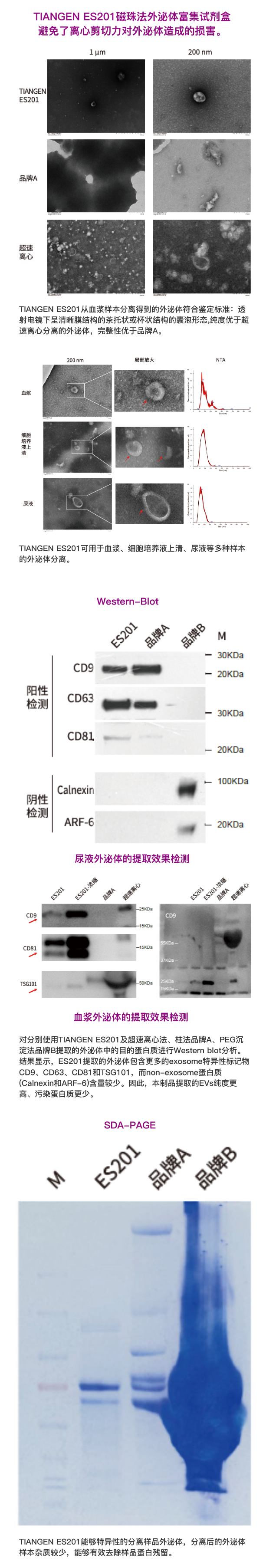 在EV研究中,选择合适的分离试剂盒至关重要。TIANGEN的磁珠法外泌体富集试剂盒以其高效、便捷和高纯度的特点,成为许多科研人员的首选。该试剂盒采用特异性磁珠,能够快速、高效地从复杂样本中分离出高纯度的外泌体,适用于多种生物样本,如细胞培养上清、血液、尿液等。使用该试剂盒,您可以获得高质量的EV样本,为后续的表征和功能研究奠定坚实基础。
